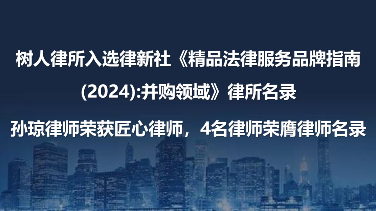 樹人榮譽| 樹人律所入選律新社《精品法律服務品牌指南(2024):并購領域》律所名錄,孫瓊律師榮獲匠心律師,4名律師榮膺律師名錄