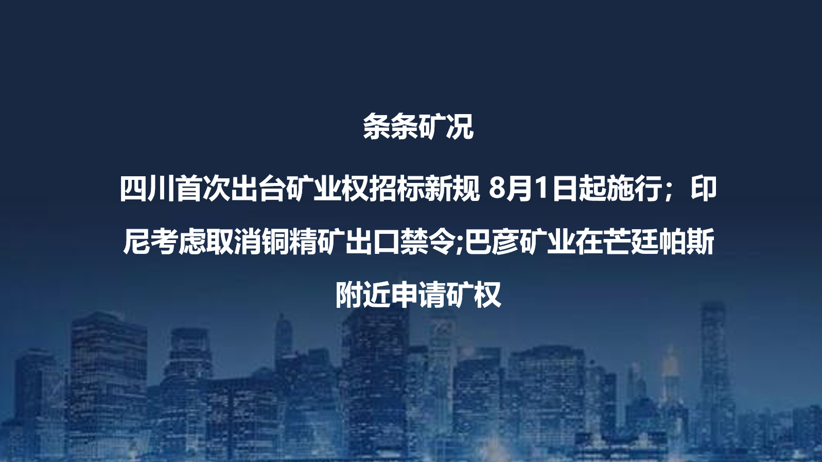 條條礦況|四川首次出臺礦業(yè)權招標新規(guī) 8月1日起施行;印尼考慮取消銅精礦出口禁令;巴彥礦業(yè)在芒廷帕斯附近申請礦權