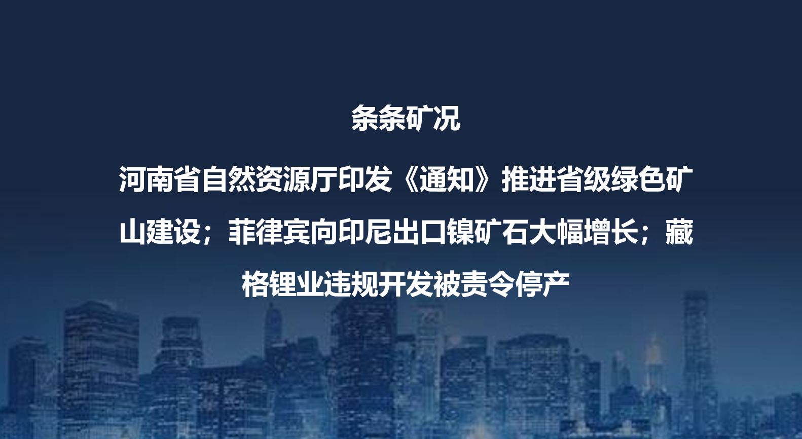 條條礦況|河南省自然資源廳印發(fā)《通知》推進省級綠色礦山建設;菲律賓向印尼出口鎳礦石大幅增長;藏格鋰業(yè)違規(guī)開發(fā)被責令停產(chǎn)