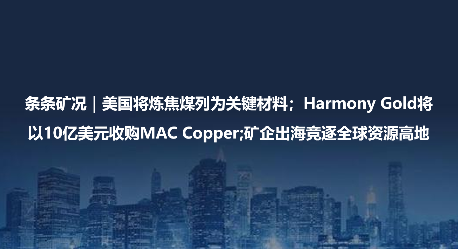 條條礦況|美國將煉焦煤列為關鍵材料;Harmony Gold將以10億美元收購MAC Copper;礦企出海競逐全球資源高地