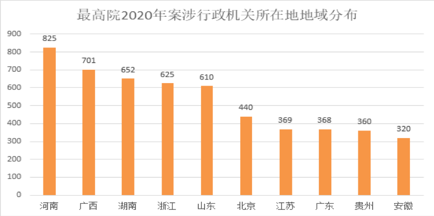 2020年最高院再審行政訴訟案件中涉案行政機(jī)關(guān)所在地地域位居前十省份的涉案數(shù)量合計(jì)5270件,占全部案件數(shù)量的比例為62.25%。各省行政訴訟案件數(shù)量不均衡。其中,河南省以825件再審行政訴訟案例位居第一,我們此前發(fā)布的《2019年度最高院再審行政訴訟案件大數(shù)據(jù)報(bào)告》中行政機(jī)關(guān)所在地地域位居第一的也是河南省,行政爭議主要集中在土地及房屋征收方面。據(jù)此,我們認(rèn)為,行政爭議與人口數(shù)量和經(jīng)濟(jì)發(fā)展水平密切相關(guān),經(jīng)濟(jì)和人口數(shù)量比較發(fā)達(dá)地區(qū)發(fā)生行政爭議的概率更大,行政訴訟的案例量也更多。