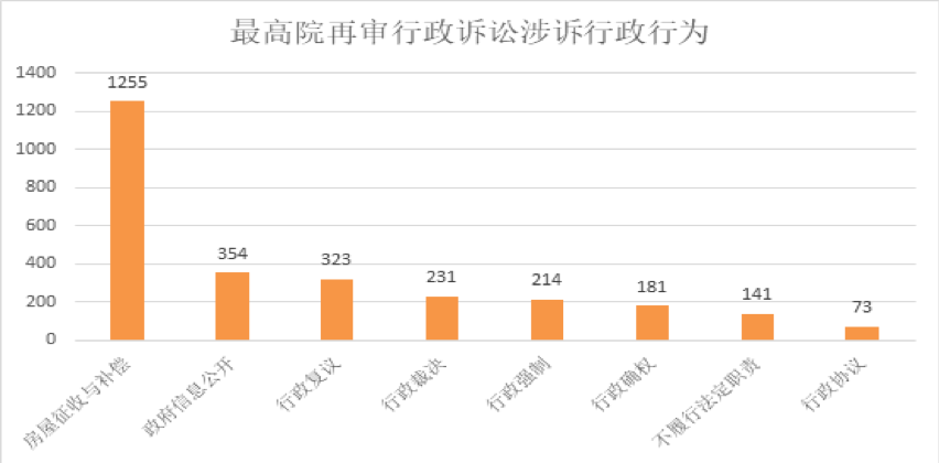 與此前我們發(fā)布的2018年、2019年《最高院再審行政訴訟案件大數(shù)據(jù)報(bào)告》相比,房屋征收與補(bǔ)償、政府信息公開、行政復(fù)議、行政強(qiáng)制等行政行為依然是最高院再審行政訴訟案件的主要涉訴行政行為。