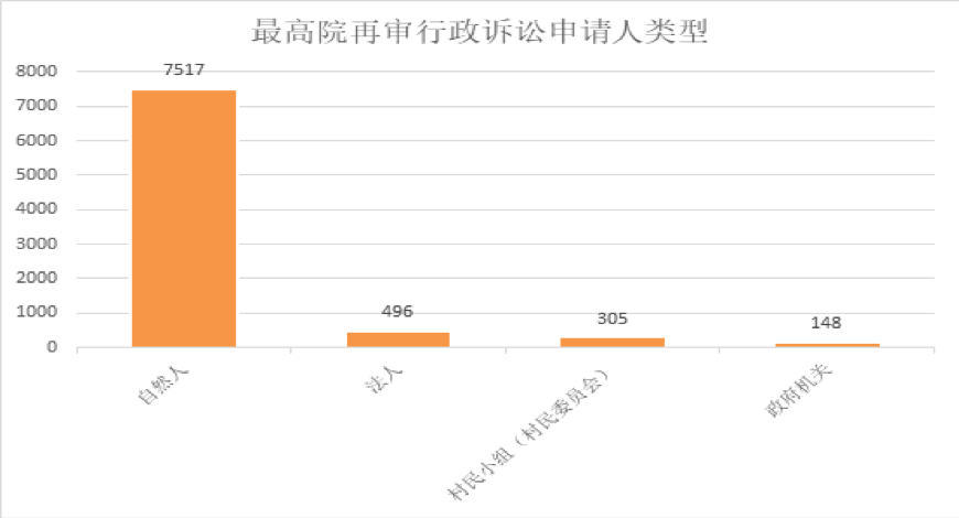 通過分析,最高院再審行政訴訟案件中的申請人包括自然人、法人、村民小組(村民委員會)等其他組織以及行政機(jī)關(guān)。不同申請人的數(shù)量如下: