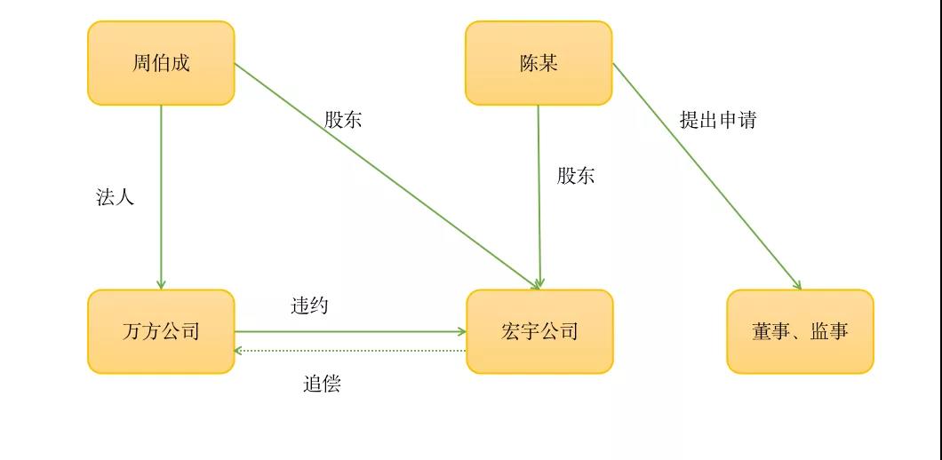宏宇有限責任公司(以下簡稱“宏宇公司”)系懷化市南區(qū)項目的建設單位。經(jīng)招標投標,南區(qū)項目由萬方公司中標施工。2011年8月28日宏宇公司與萬方公司簽訂《建設工程施工合同》,約定工程總建筑面積302103.85平方米,價款暫定36000萬元。合同專用條款第47條第12項特別約定:“本工程未經(jīng)發(fā)包人同意不得分包,如承包人擅自分包,發(fā)包人有權要求承包人按分包工程總價的20%支付違約金。”萬方公司違反合同約定,未經(jīng)宏宇公司同意,將工程分包給沒有資質(zhì)的個人。按照合同約定,萬方公司應當向宏宇公司支付違約金7200萬元。與此同時,萬方公司的法定代表人周伯成屬于宏宇公司的股東,存在重大利益沖突,因此宏宇公司未提起訴訟追究萬方公司的違約責任。宏宇公司未設立監(jiān)事會、董事會,僅有董事黃某、監(jiān)事周某。陳某向董事與監(jiān)事發(fā)送書面函件要求對萬方公司提起訴訟,但是董事黃某與監(jiān)事周某均未提起。