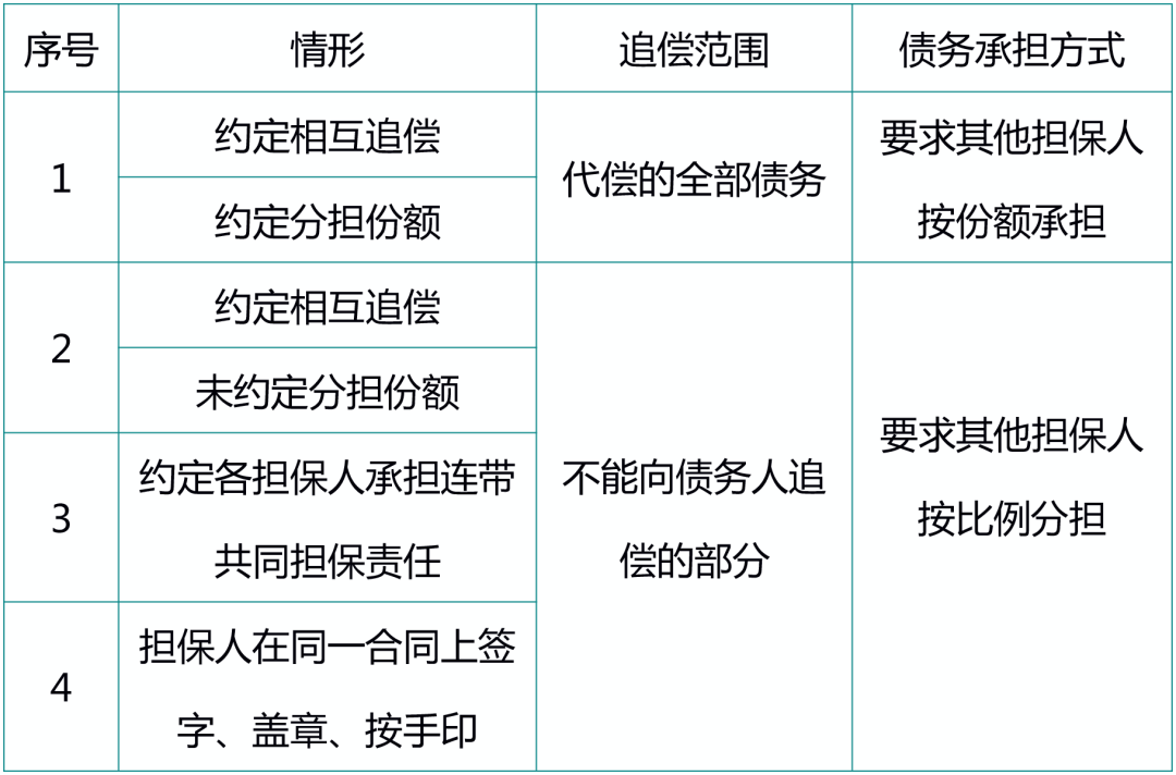 按照上述法律規(guī)定確定的相互追償規(guī)則,僅在下列四種情形下,擔(dān)保人之間可相互追償: