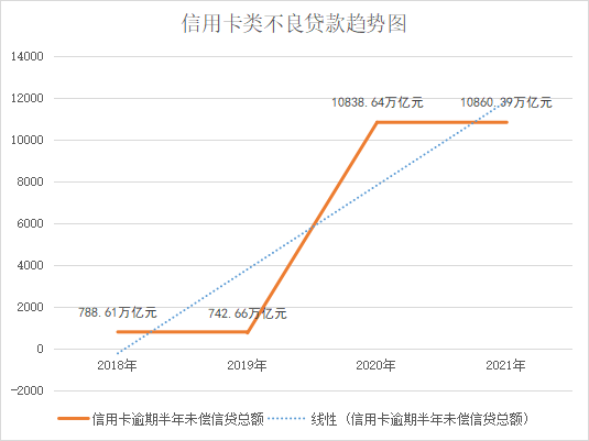 2022年4月2日,中國人民銀行發(fā)布《2021年支付體系運行總體情況》,截至2021年末,全國共開立信用卡和借貸合一卡8.00億張,同比增長2.85%,人均持有信用卡和借貸合一卡0.57張。截至2021年末,銀行卡授信總額為21.02萬億元,同比增長10.86%;銀行卡應(yīng)償信貸余額為8.62萬億元,同比增長8.90%。信用卡逾期半年未償信貸總額10860.39億元,占信用卡應(yīng)償信貸余額的1.00%。相比之下,2020年末的信用卡逾期半年未償信貸總額為10838.64億元,2019年為742.66億元,2018年為788.61億元,信用卡類個人不良貸款呈穩(wěn)步增長的態(tài)勢。