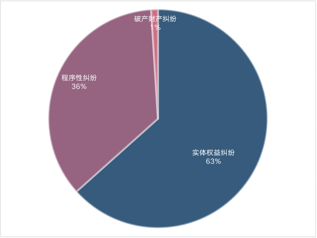 我們針對2020年以來的破產(chǎn)債權(quán)確認(rèn)糾紛類17,900件案例進(jìn)行系統(tǒng)分析,主要?jiǎng)澐譃槿悾磳?shí)體權(quán)益類糾紛11,368件,占比63%;與破產(chǎn)程序相關(guān)的糾紛6,378件,占比36%;與債務(wù)人財(cái)產(chǎn)有關(guān)糾紛包括別除權(quán)、撤銷權(quán)和取回權(quán)等糾紛154件,占比1%。