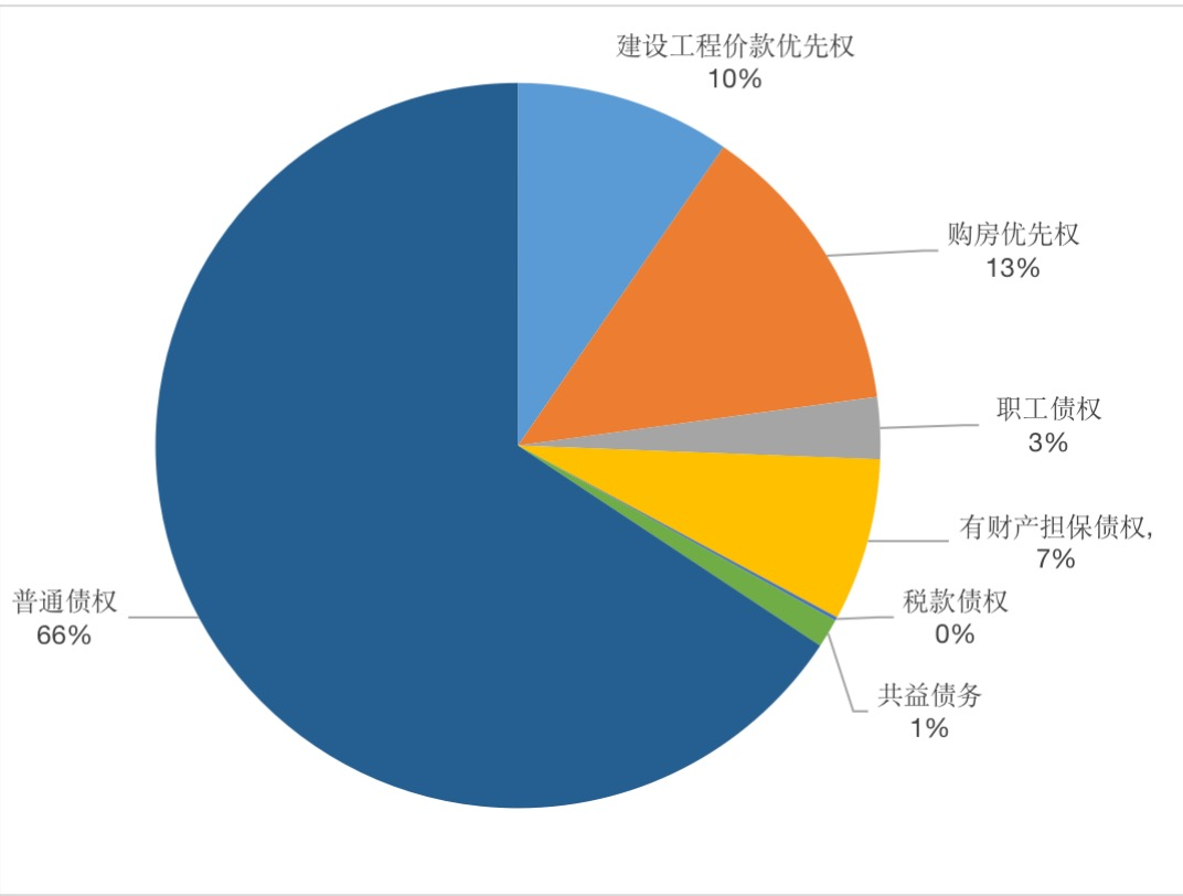 在11,368件實(shí)體權(quán)益糾紛案件中,按照破產(chǎn)法中的權(quán)益性質(zhì)即共益?zhèn)鶆?wù)、購房優(yōu)先權(quán)、建設(shè)工程價(jià)款優(yōu)先權(quán)、有財(cái)產(chǎn)擔(dān)保債權(quán)、職工債權(quán)、稅款債權(quán)、普通債權(quán)劃分,具體情況如下: