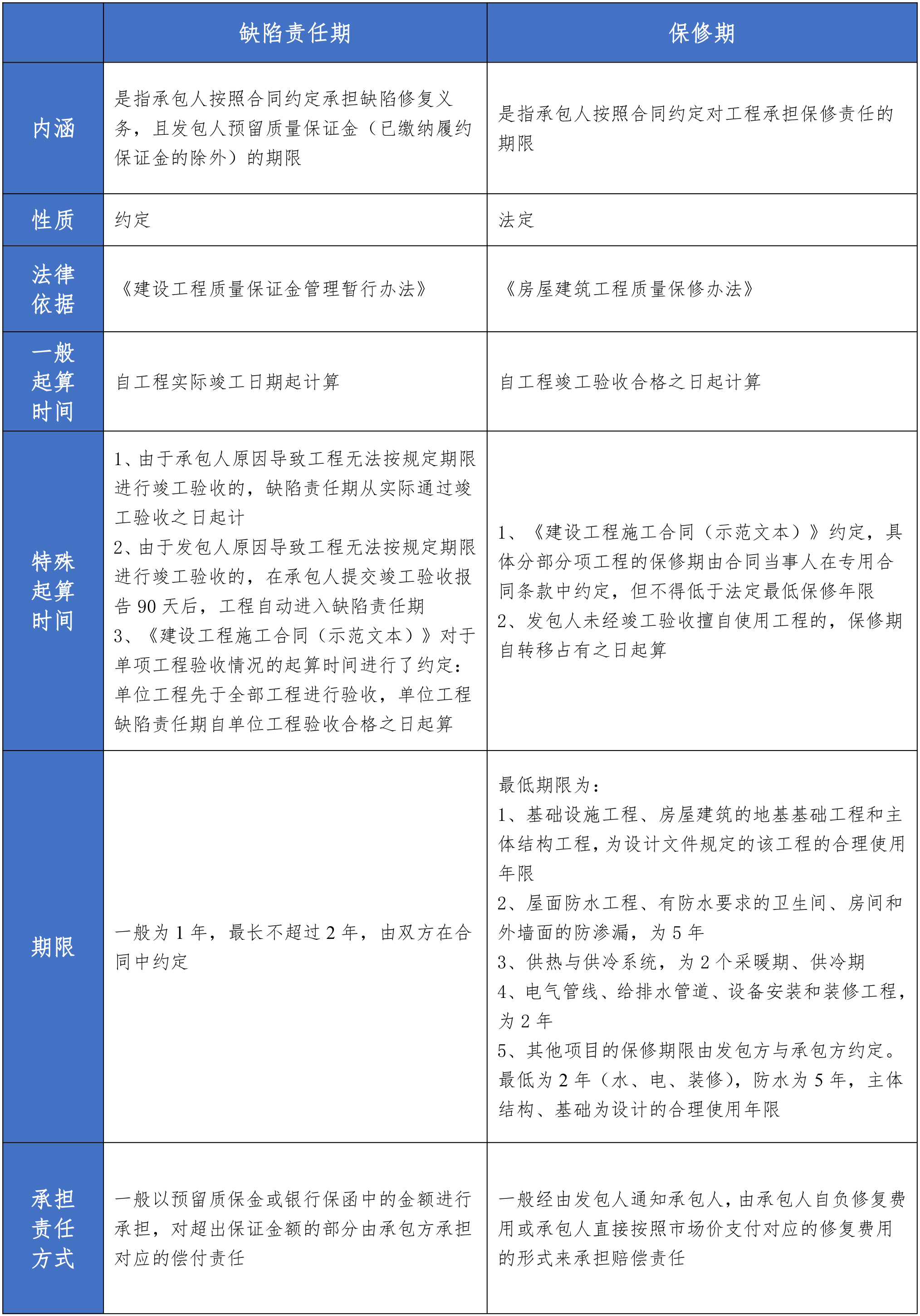 缺陷責任期與保修期在起算時間、期限、承擔責任的方式等方面存在明顯的不同,作者將其整理為下表以便對比。