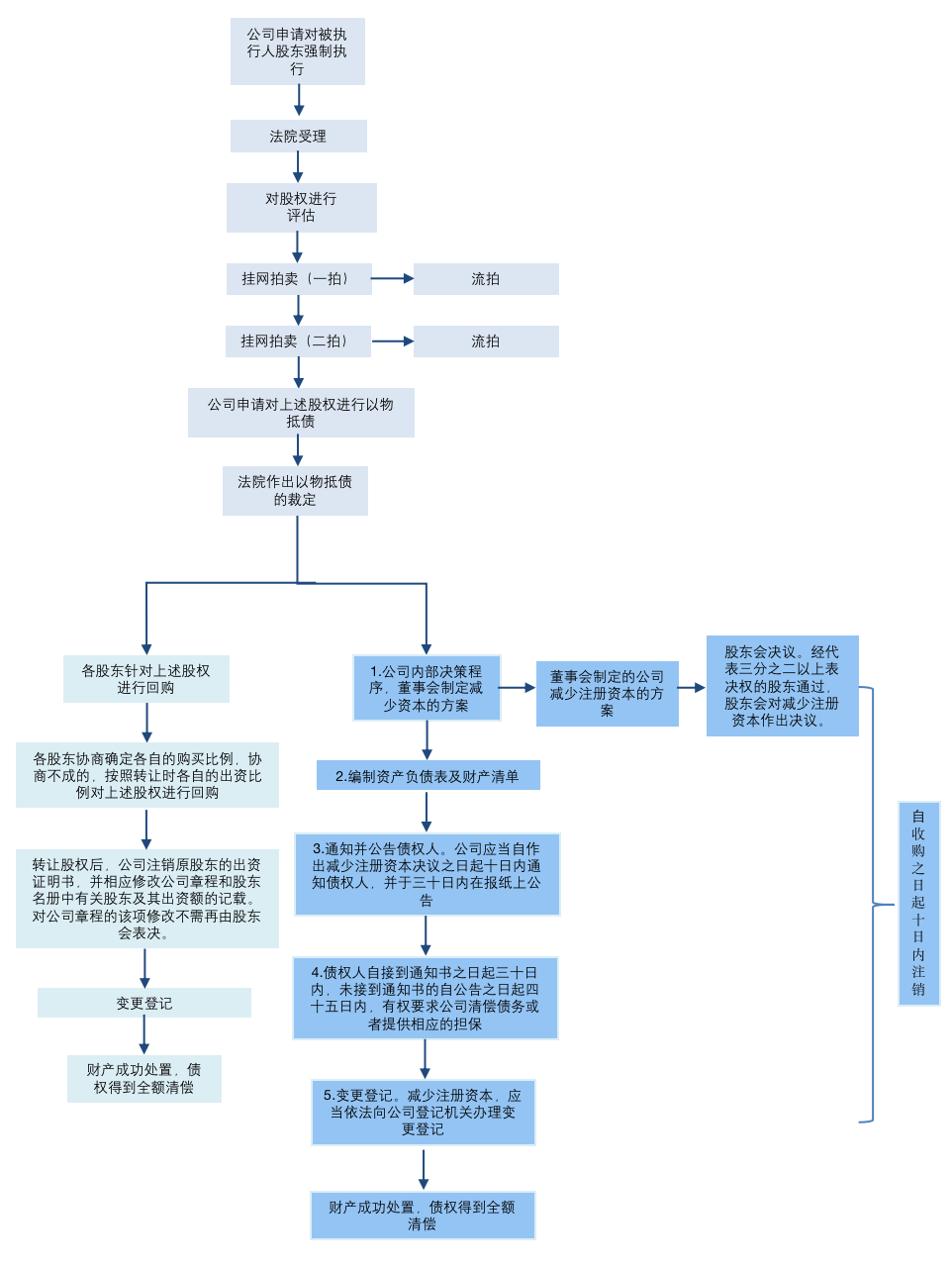上述兩種方式在公司債權(quán)得以實(shí)現(xiàn)的基礎(chǔ)上又維護(hù)了公司的穩(wěn)定性,公司其他股東內(nèi)部回購(gòu)股權(quán)使公司在原有的注冊(cè)資本范圍內(nèi)資本維持。減資需要經(jīng)過(guò)股東會(huì)決議,雖是股東自治的行為,但由于變更了公司原有的資本因此可能對(duì)債權(quán)人帶來(lái)影響,需給予事先的程序與實(shí)質(zhì)的保障,給外在的債權(quán)人以充分的保護(hù),從而使公司在新的注冊(cè)資本范圍內(nèi)的資本充實(shí)和資本維持,符合《中華人民共和國(guó)公司法》的立法本意,同時(shí)根據(jù)《最高人民法院關(guān)于適用<中華人民共和國(guó)公司法>若干問(wèn)題的規(guī)定(二)》第五條:“人民法院審理解散公司訴訟案件,應(yīng)當(dāng)注重調(diào)解。當(dāng)事人協(xié)商同意由公司或者股東收購(gòu)股份,或者以減資等方式使公司存續(xù),且不違反法律、行政法規(guī)強(qiáng)制性規(guī)定的,人民法院應(yīng)予支持。當(dāng)事人不能協(xié)商一致使公司存續(xù)的,人民法院應(yīng)當(dāng)及時(shí)判決。”的規(guī)定,當(dāng)公司進(jìn)行減資或者股東收購(gòu)股份時(shí),只要不違反法律、行政法規(guī)強(qiáng)制性規(guī)定的,人民法院應(yīng)當(dāng)予以支持,因此筆者認(rèn)為在法院作出股東以股抵債的裁定后,公司可以進(jìn)行上述程序從而實(shí)現(xiàn)自己的債權(quán)。