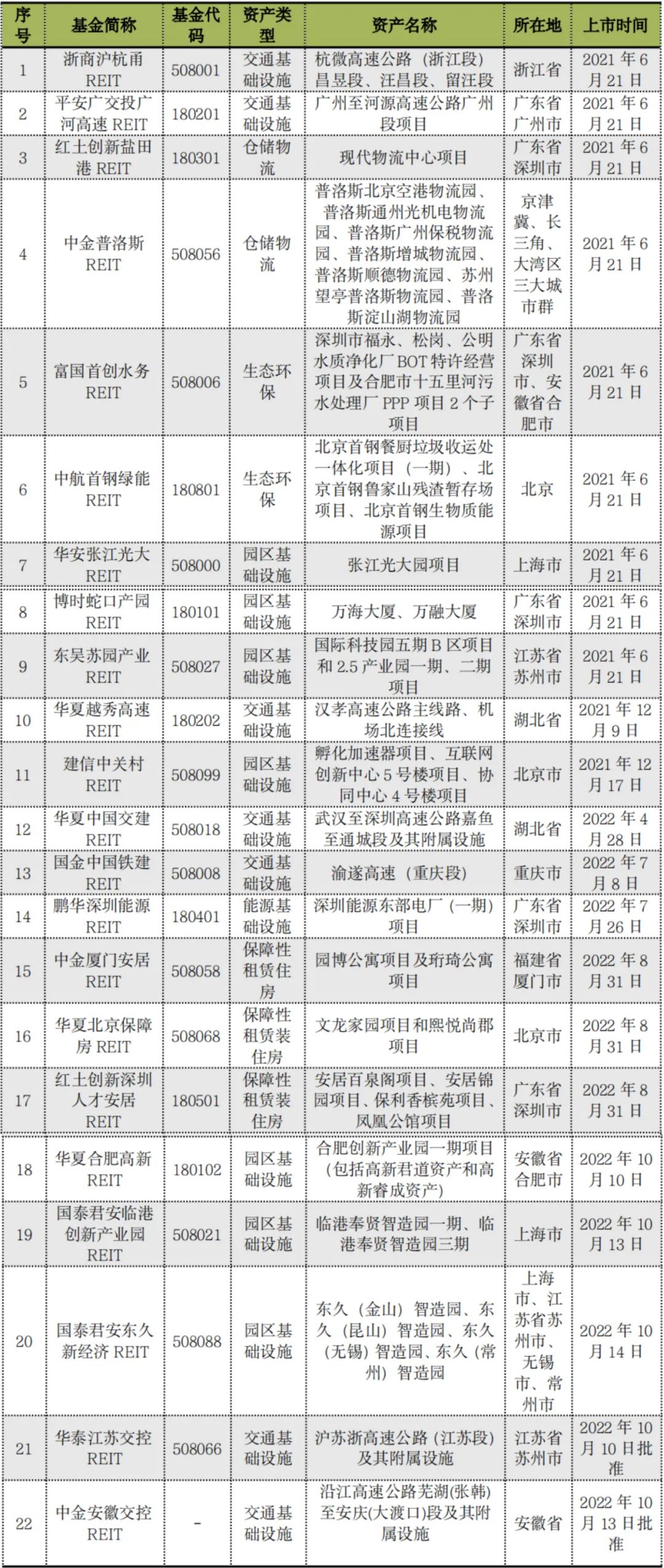 截至2022年10月18日,市場(chǎng)上成功發(fā)售的基礎(chǔ)設(shè)施公募REITs已經(jīng)增至22只,已上市公募REITs的底層項(xiàng)目涵蓋產(chǎn)業(yè)園區(qū)、倉儲(chǔ)物流、高速公路、環(huán)保水務(wù)、清潔能源、保障性租賃住房等六大行業(yè)類型。具體情況如下: