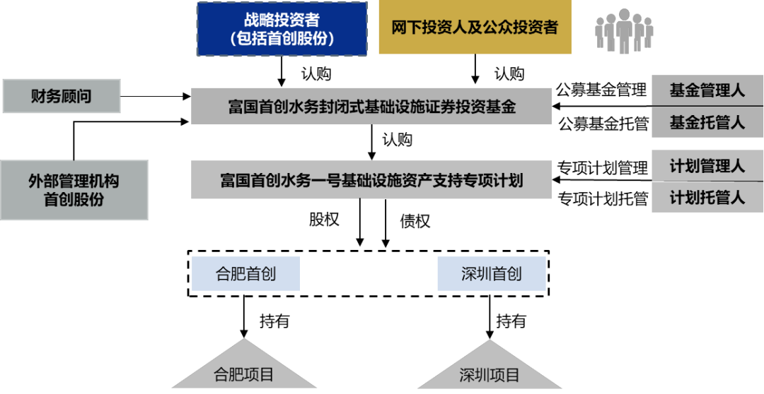 以富國首創(chuàng)水務(wù)REIT為例,經(jīng)檢索巨潮咨詢網(wǎng)(http://www.cninfo.com.cn/),富國首創(chuàng)水務(wù)REIT的交易結(jié)構(gòu)如下: