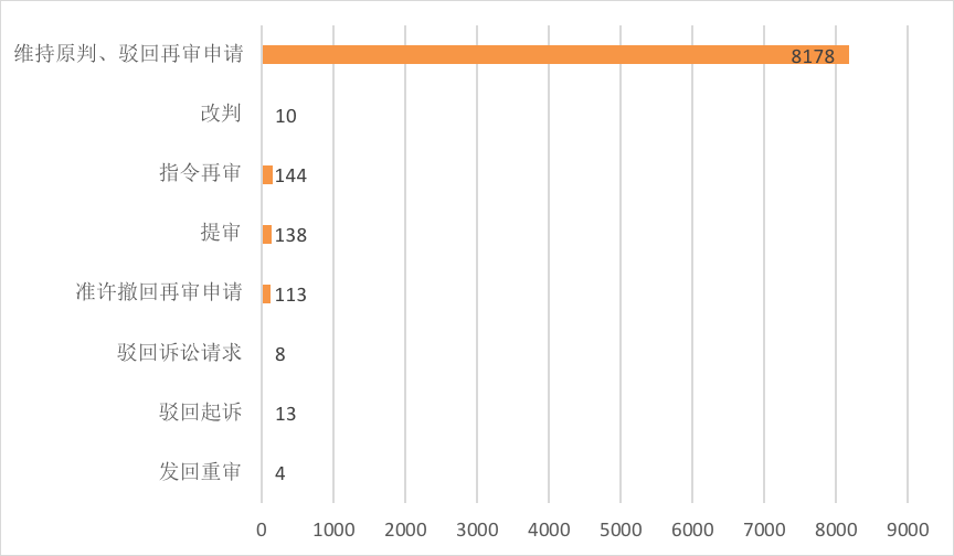 通過對(duì)8610份裁判文書的裁判結(jié)果進(jìn)行分析,最高院維持原判駁回再審申請(qǐng)的裁判文書共計(jì)8178份,占比94.98%;提審的裁判文書共計(jì)138份,占比1.60%;指令再審的裁判文書共計(jì)144份,占比1.67%;準(zhǔn)許再審申請(qǐng)人撤回再審申請(qǐng)的裁判文書共計(jì)113份,占比1.31%;撤銷裁判的裁判文書共計(jì)10份,占比0.12%;發(fā)回重審的裁判文書共計(jì)4份,占比0.05%;駁回起訴的裁判文書共計(jì)13份,占比0.15%;駁回訴訟請(qǐng)求的裁判文書共計(jì)8份,占比0.09%。