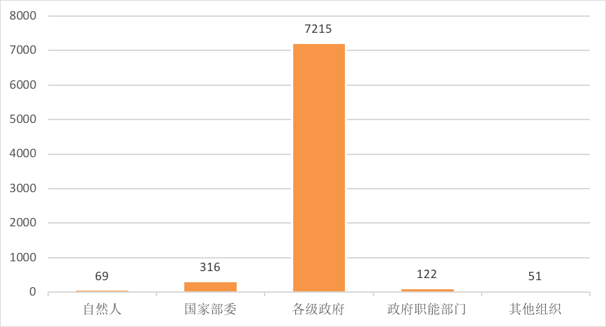 鑒于最高院8610份裁判文書中有837份裁判文書是關(guān)于再審申請(qǐng)人不服人民法院作出的駁回起訴裁定、不予受理裁定等裁定文書提起的再審申請(qǐng),該類裁判文書僅載明再審申請(qǐng)人的身份信息,故,本報(bào)告分析被申請(qǐng)人時(shí),剔除上述837份裁判文書,剩余7773份裁判文書中的被申請(qǐng)人主要包括自然人、國(guó)家部委、各級(jí)政府(包括省、市、縣、鎮(zhèn)政府及街道辦事處)、政府職能部門以及其他組織等五大類。被申請(qǐng)人具體分布情況如下: