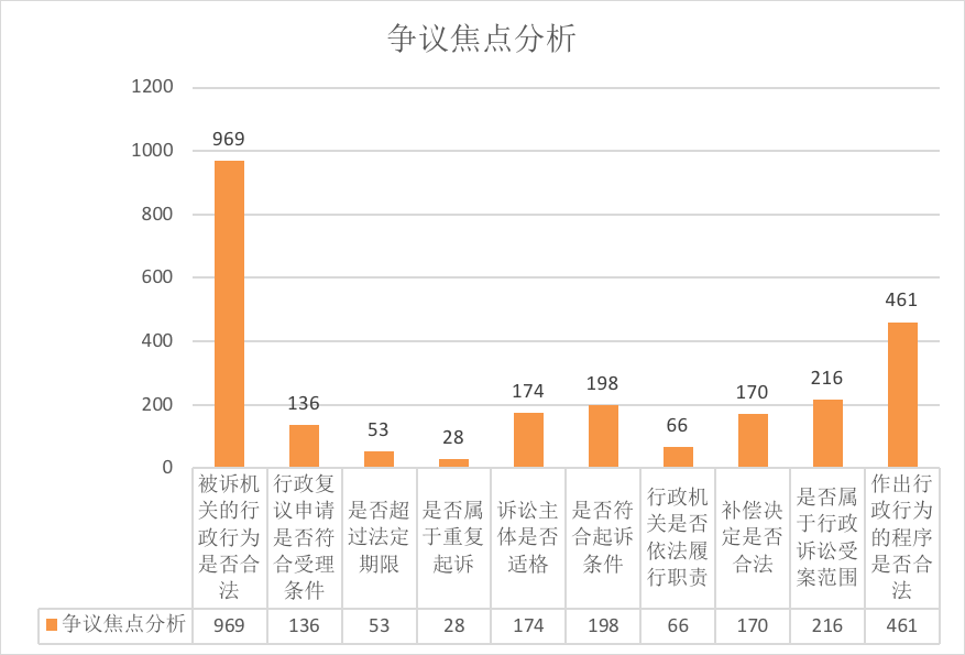 通過對(duì)8610份裁判文書的深入分析,2019年度最高院再審行政案件中有明確爭(zhēng)議焦點(diǎn)的裁判文書共計(jì)1926份,其中爭(zhēng)議焦點(diǎn)主要包括行政訴訟是否符合起訴條件、行政訴訟是否屬于重復(fù)起訴、行政訴訟是否超過法定期限、訴訟主體是否適格、被訴機(jī)關(guān)的行政行為是否合法、行政機(jī)關(guān)是否依法履行職責(zé)、補(bǔ)償決定是否合法,行政復(fù)議申請(qǐng)是否符合受理?xiàng)l件等。上述爭(zhēng)議焦點(diǎn)出現(xiàn)的頻次如下:
