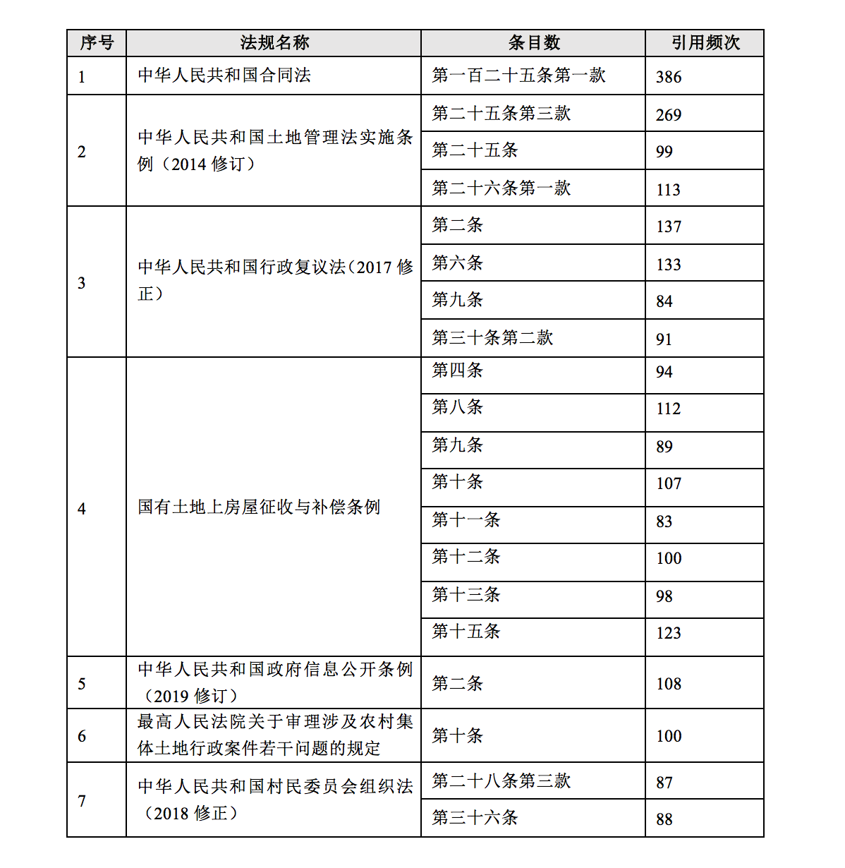 據(jù)統(tǒng)計(jì),最高院對(duì)行政訴訟案件進(jìn)行再審時(shí)適用的高頻實(shí)體法包括《中華人民共和國(guó)合同法》、《中華人民共和國(guó)土地管理法實(shí)施條例(2014修訂)》、《中華人民共和國(guó)行政復(fù)議法(2017修正)》、《國(guó)有土地上房屋征收與補(bǔ)償條例》、《中華人民共和國(guó)政府信息公開條例(2019修訂)》、《最高人民法院關(guān)于審理涉及農(nóng)村集體土地行政案件若干問題的規(guī)定》、《中華人民共和國(guó)村民委員會(huì)組織法(2018修正)》,其中高頻條款及引用頻次如下: