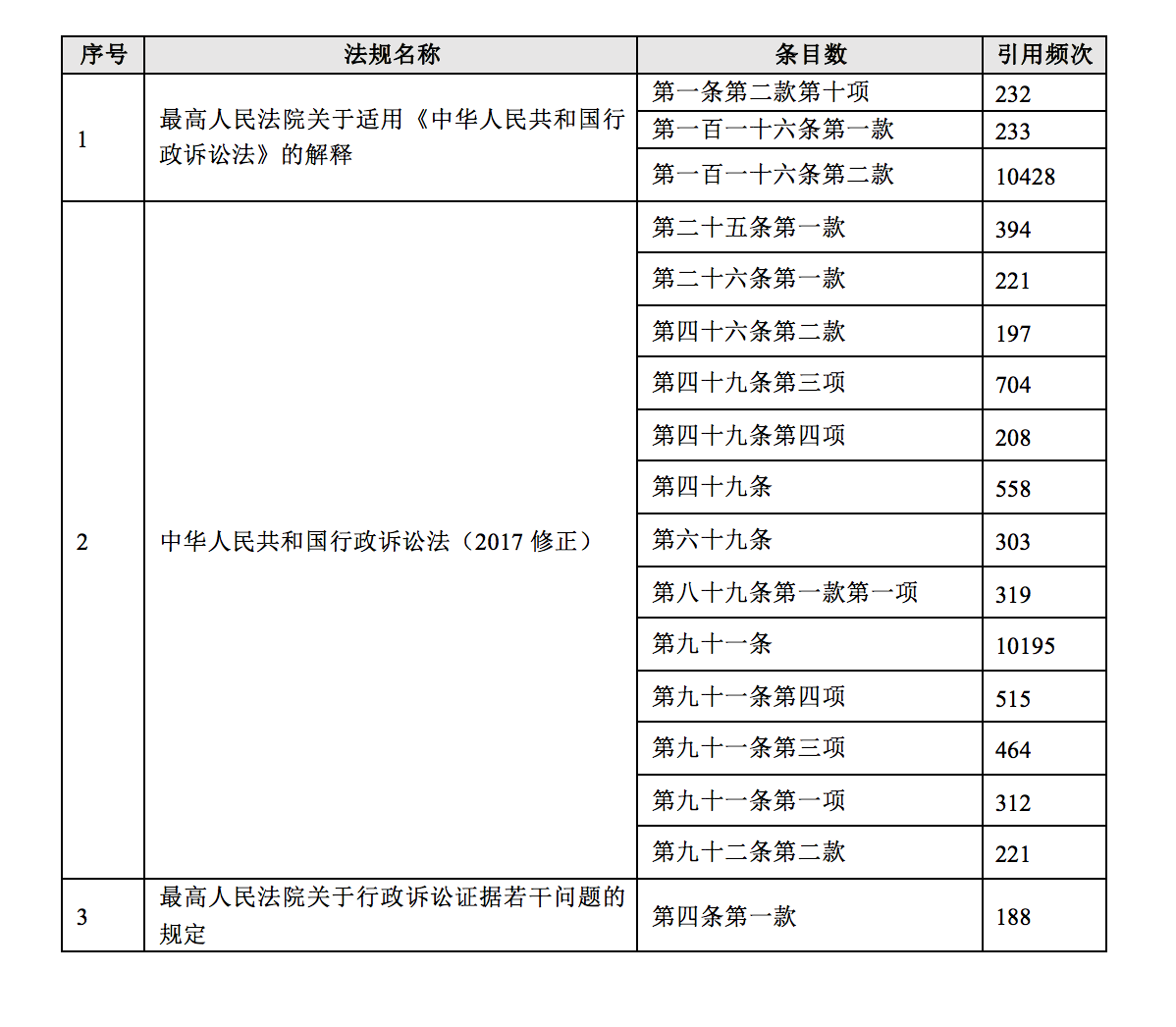 據(jù)統(tǒng)計(jì),最高院對(duì)行政訴訟案件進(jìn)行再審時(shí)適用的高頻程序法包括《最高人民法院關(guān)于適用<中華人民共和國(guó)行政訴訟法>的解釋》、《中華人民共和國(guó)行政訴訟法(2017修正)》、《最高人民法院關(guān)于行政訴訟證據(jù)若干問題的規(guī)定》,其中高頻條款及引用頻次如下: