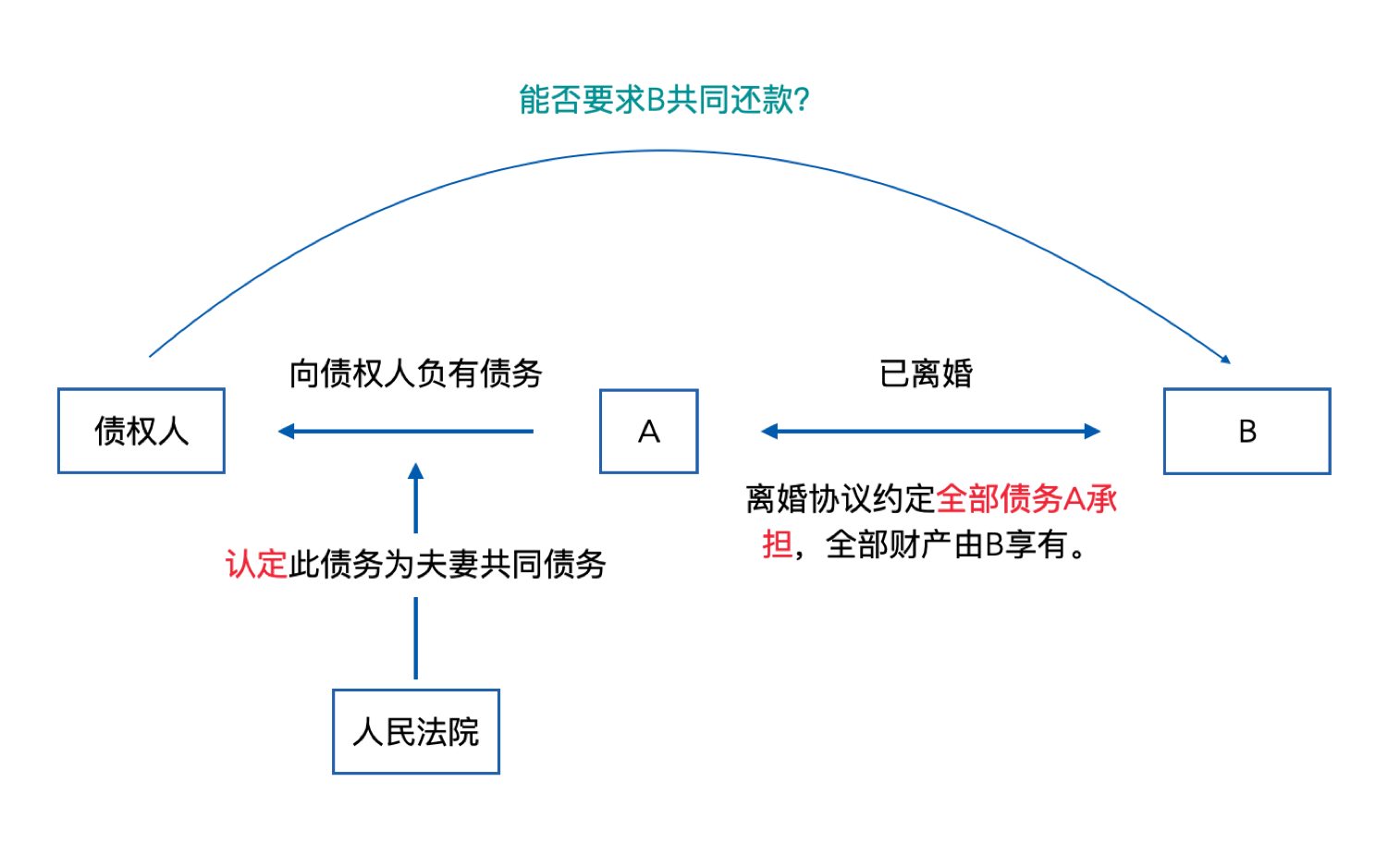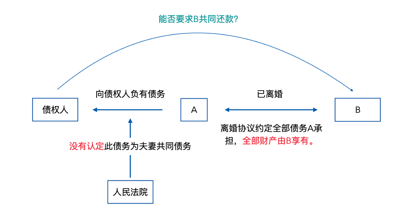 A、B為夫妻,當(dāng)A以個人名義所負(fù)債務(wù)可能不會被法院認(rèn)定為夫妻共同債務(wù)時,債權(quán)人要求A、B承擔(dān)共同還款責(zé)任,此時B拿出《離婚協(xié)議》,表示雙方已約定債務(wù)全部由A承擔(dān),債權(quán)人能否繼續(xù)要求B承擔(dān)共同還款責(zé)任?
