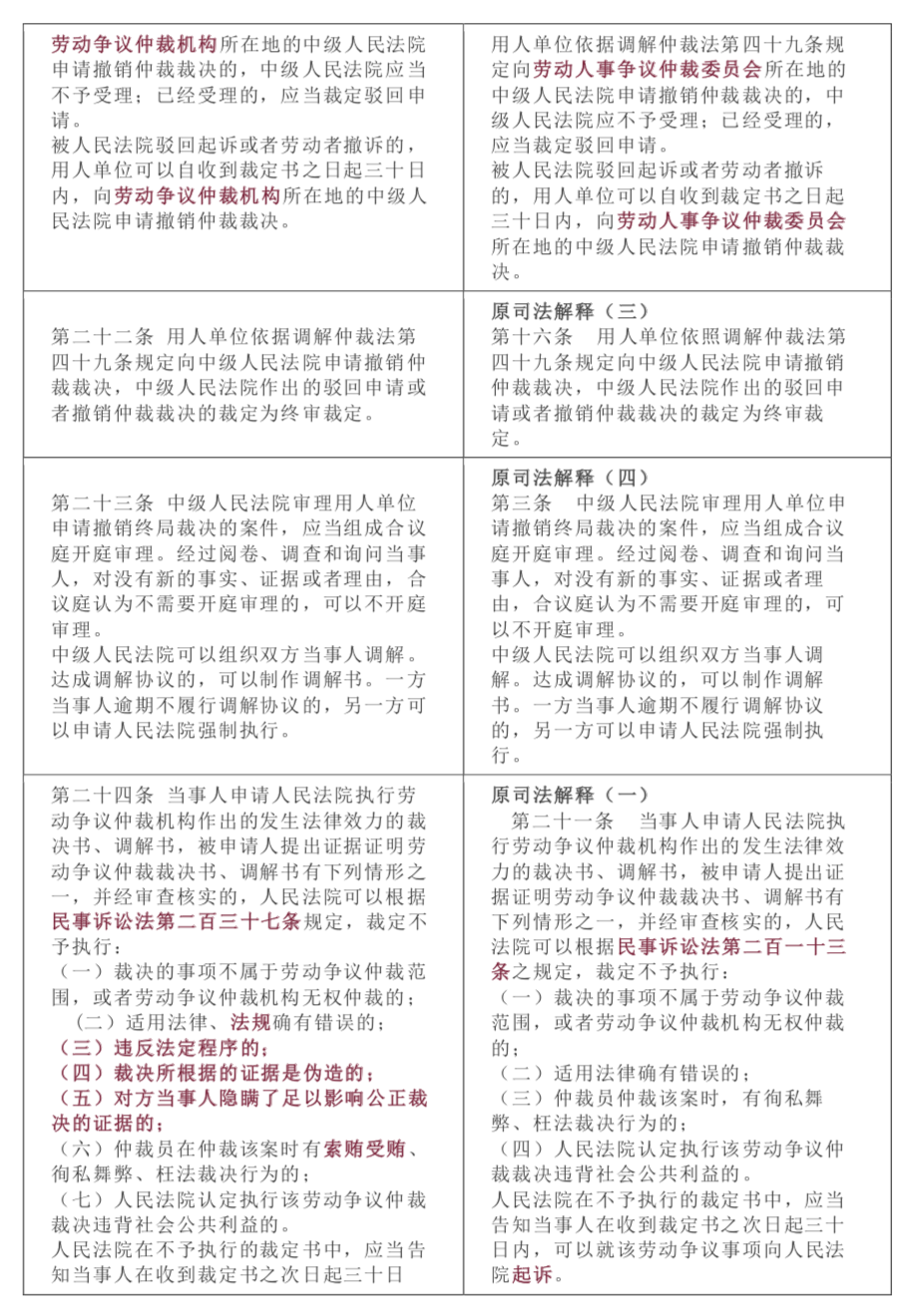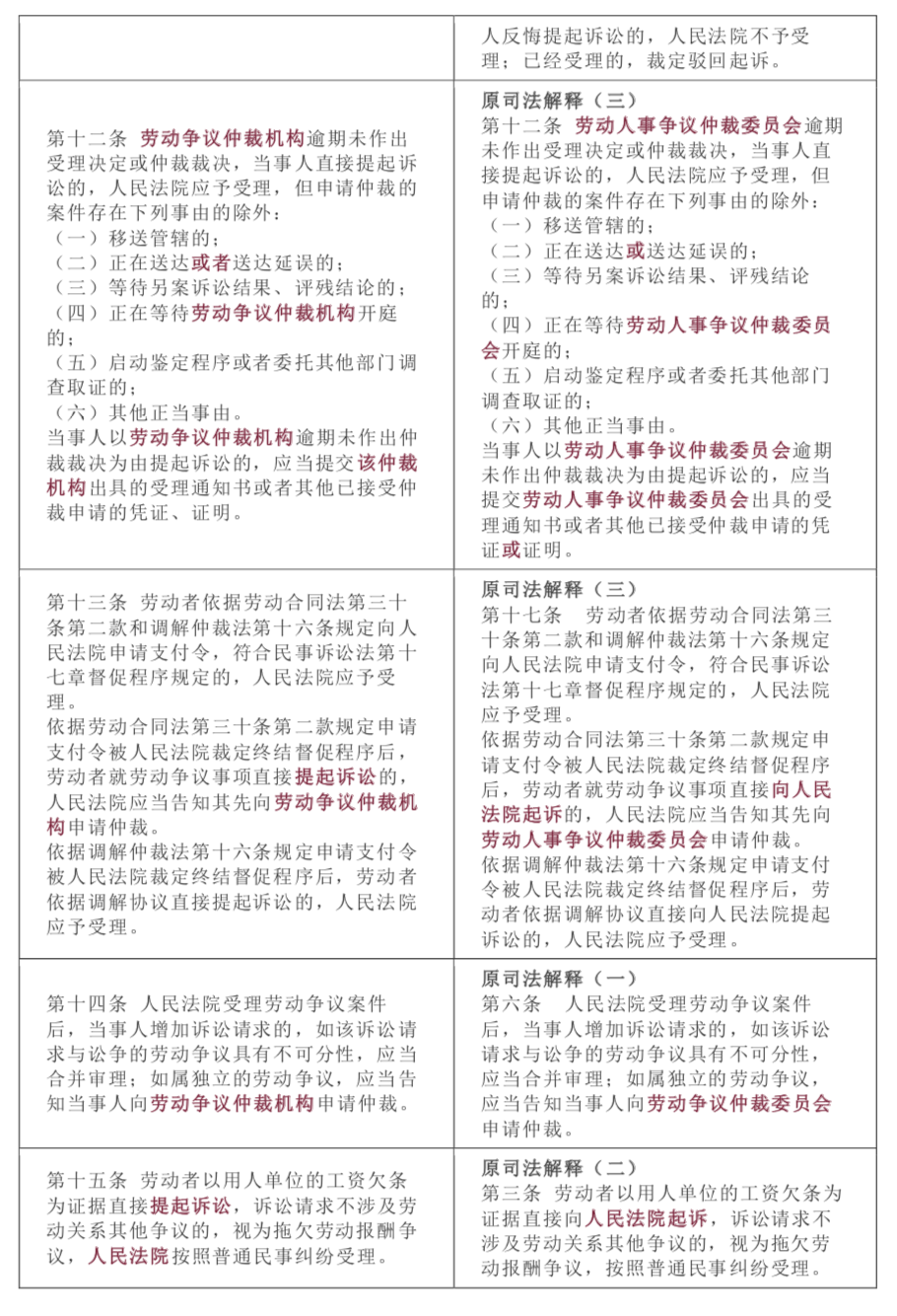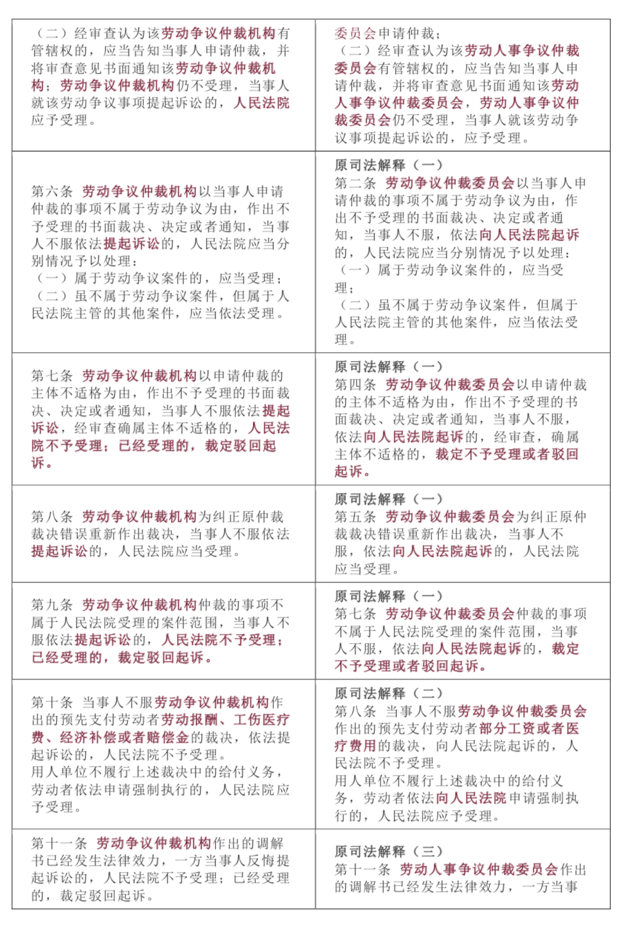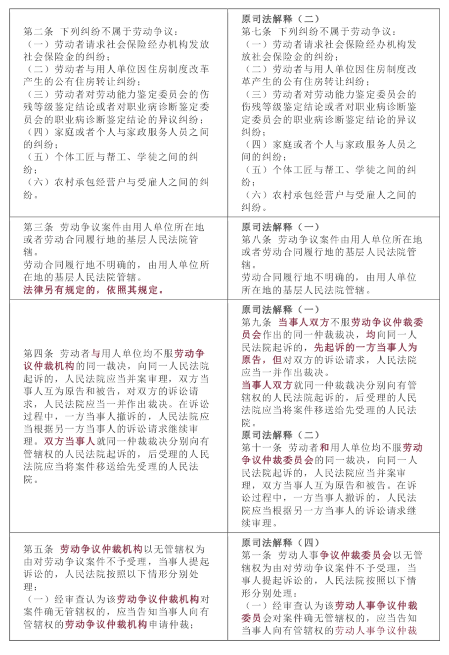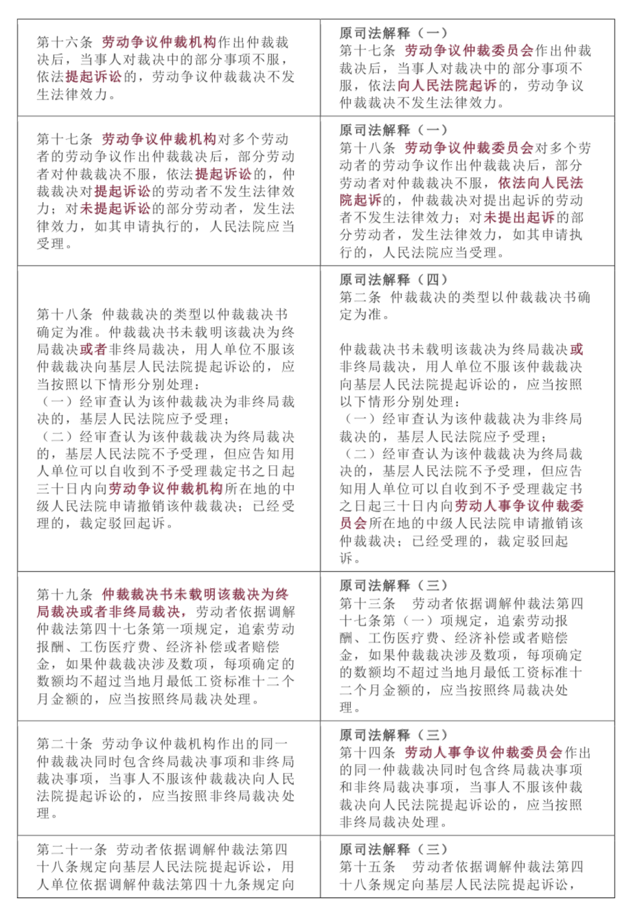 此外,新解釋還將舊解釋中術(shù)語進(jìn)行了統(tǒng)一和調(diào)整,將解釋與現(xiàn)行的其他法律法規(guī)的表述更加契合,如將“勞動爭議仲裁委員會”調(diào)整為“勞動爭議仲裁機(jī)構(gòu)”;將“或”調(diào)整為“或者”;將“向人民法院起訴”、“提出起訴”統(tǒng)一調(diào)整為“提起訴訟”;將“勞動爭議調(diào)解委員會”調(diào)整為“調(diào)解仲裁法第十條規(guī)定的調(diào)解組織”。