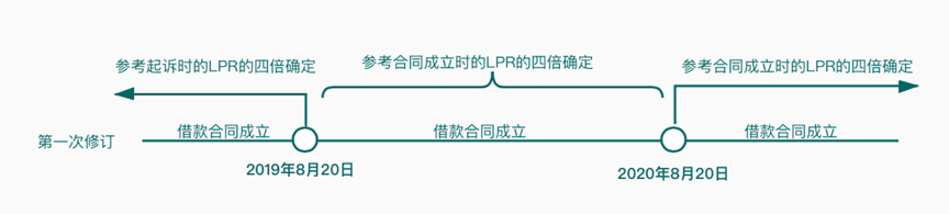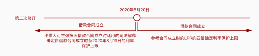 如上圖所示,《民間借貸司法解釋第二次修訂》改變了《民間借貸司法解釋第一次修訂》中所確定的“一刀切”地適用一年期的貸款市場報價利率的四倍的標(biāo)準(zhǔn)?!睹耖g借貸司法解釋第二次修訂》以2020年8月20日為分界點,對于借款合同成立于2020年8月20日前的民間借貸糾紛案件,出借人可以主張按照合同成立時所適用的司法解釋所確定的利率保護(hù)上限計算自借款合同成立后至2020年8月19日期間的利息,對于借款合同成立于2020年8月20日后的民間借貸糾紛案件,繼續(xù)適用一年期的貸款市場報價利率的四倍。