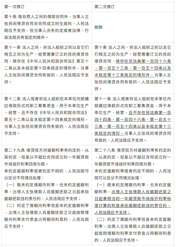 2020年12月29日,最高人民法院頒布了《最高人民法院關(guān)于審理民間借貸案件適用法律若干問題的規(guī)定(2020年第二次修訂)》(以下簡稱“《民間借貸司法解釋第二次修訂》”),并于2021年1月1日起正式施行。本次修訂距離最高人民法院于2020年8月19日頒布并于2020年8月20日正式施行的《最高人民法院關(guān)于審理民間借貸案件適用法律若干問題的規(guī)定(2020修訂)》(以下簡稱“《民間借貸司法解釋第一次修訂》”)過去不到五個月,那么兩次修訂又有什么不同呢?通過比對兩次修訂內(nèi)容,可發(fā)現(xiàn)如下條款發(fā)生了變更: