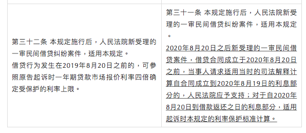 由上圖可知,《民間借貸司法解釋第一次修訂》明確將借款利率的最高保護(hù)上限確定為一年期的貸款市場報價利率的四倍。同時,《民間借貸司法解釋第一次修訂》明確無論雙方爭議的民間借款合同成立于何時,只要在《民間借貸司法解釋第一次修訂》正式施行后(即2020年8月20日后)由人民法院受理的民間借貸糾紛案件,人民法院均應(yīng)當(dāng)適用一年期的貸款市場報價利率的四倍對當(dāng)事人的訴訟請求進(jìn)行審理、裁判。這導(dǎo)致雙方在借款合同中所約定的利率即使符合合同成立時生效且正在適用的司法解釋的規(guī)定,在2020年8月20日起訴后也全部“一刀切”的適用一年期的貸款市場報價利率的四倍作為最高保護(hù)標(biāo)準(zhǔn)。當(dāng)事人所約定的利率超過一年期的貸款市場報價利率的四倍的,人民法院將不予支持。