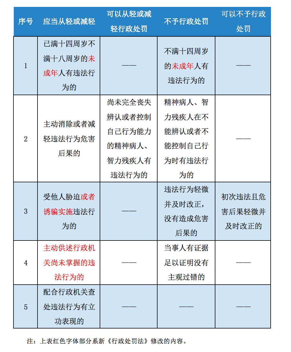 首違不罰即首次違法且危害后果輕微并及時改正的,可以不予行政處罰。其最早是國家稅務(wù)部門為規(guī)范行政處罰自由裁量權(quán)引入的制度。此次,新《行政處罰法》以法律的形式將其納入行政處罰法律體系,對行政機(jī)關(guān)依法執(zhí)法、保障當(dāng)事人合法權(quán)益具有重大意義。首違不罰明確納入新《行政處罰法》后,其中關(guān)于從輕或減輕行政處罰、不予行政處罰的具體情形與以往相比有了較大變化,具體內(nèi)容如下: