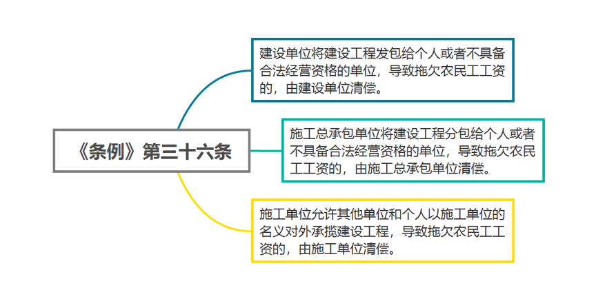 《保障農(nóng)民工工資支付條例》(以下簡(jiǎn)稱:“《條例》”)第三十六條規(guī)定:“建設(shè)單位或者施工總承包單位將建設(shè)工程發(fā)包或者分包給個(gè)人或者不具備合法經(jīng)營(yíng)資格的單位,導(dǎo)致拖欠農(nóng)民工工資的,由建設(shè)單位或者施工總承包單位清償。施工單位允許其他單位和個(gè)人以施工單位的名義對(duì)外承攬建設(shè)工程,導(dǎo)致拖欠農(nóng)民工工資的,由施工單位清償。”