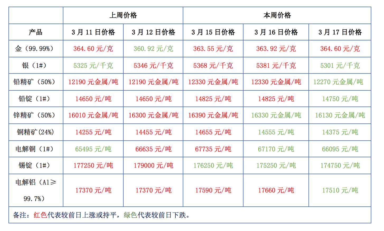 下表為本周金、銀、鉛、鋅、銅、鋁等主要有色金屬礦產(chǎn)品價(jià)格變動(dòng)情況: