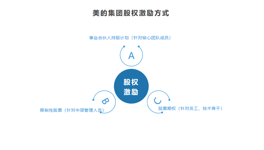 通過(guò)有層次,有針對(duì)性的股權(quán)激勵(lì)計(jì)劃,美的集團(tuán)在保證公司體量不斷發(fā)展壯大的同時(shí)也抓住了新興企業(yè)的優(yōu)秀特質(zhì),保證了公司的沖勁。