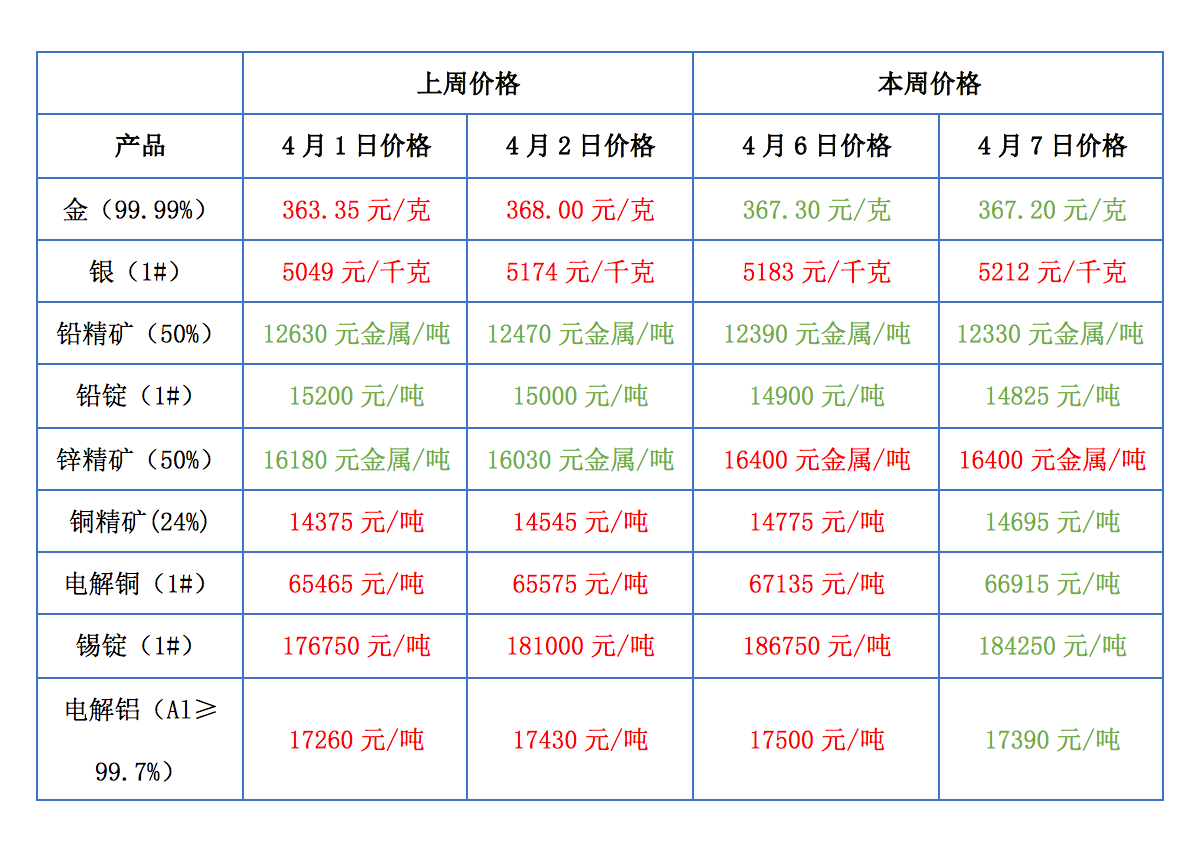下表為本周金、銀、鉛、鋅、銅、鋁等主要有色金屬礦產(chǎn)品價(jià)格變動情況: