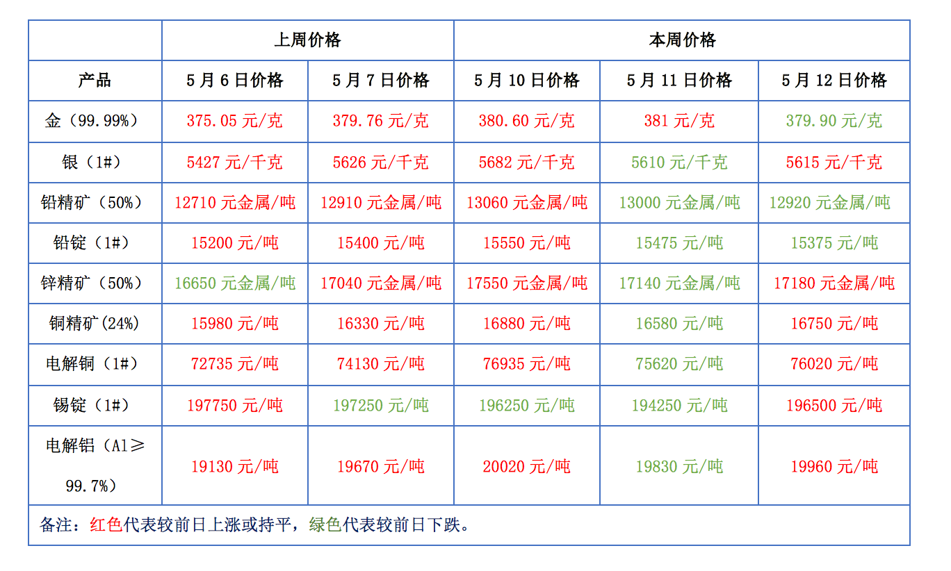 下表為本周金、銀、鉛、鋅、銅、鋁等主要有色金屬礦產(chǎn)品價(jià)格變動(dòng)情況: