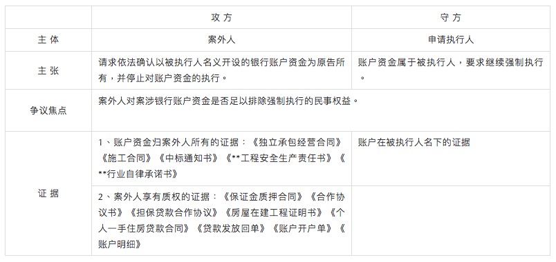 根據(jù)起訴主體的不同,雖訴辯主張、證據(jù)組織等均有不同,但參與對(duì)抗的兩方主體基本固定,即:請(qǐng)求依法確認(rèn)以被執(zhí)行人名義開(kāi)設(shè)的銀行賬戶資金為其所有,并要求排除強(qiáng)制執(zhí)行的為攻方;申請(qǐng)對(duì)被執(zhí)行人銀行賬戶資金繼續(xù)執(zhí)行的為守方。