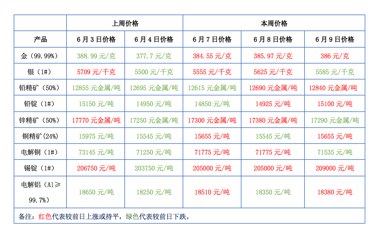 下表為本周金、銀、鉛、鋅、銅、鋁等主要有色金屬礦產(chǎn)品價(jià)格變動(dòng)情況: