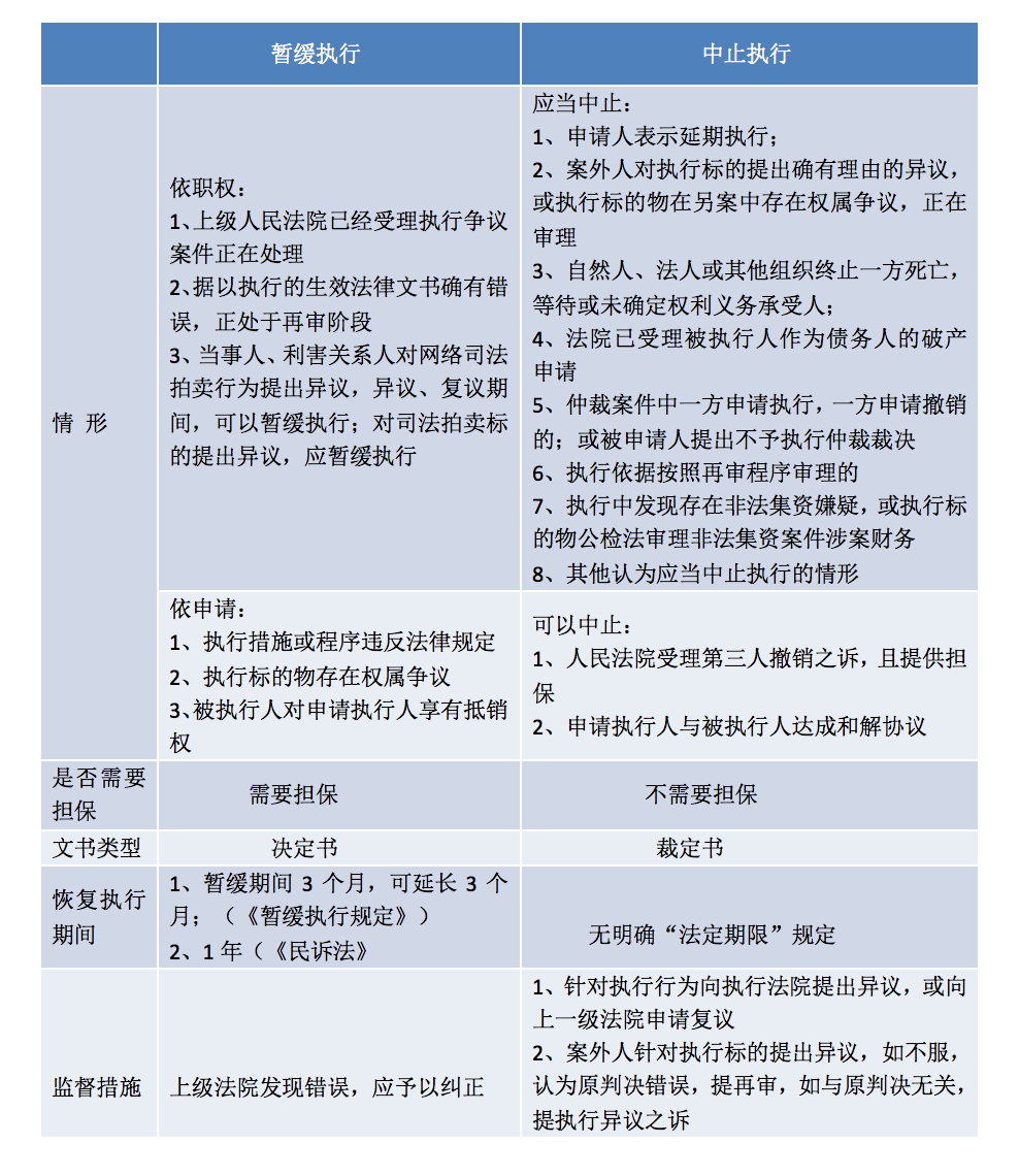 在民事執(zhí)行案件中,因財產線索、當事人主體變更、案外人執(zhí)行異議等因素導致執(zhí)行程序存在極大的不確定性,執(zhí)行程序中經常會出現(xiàn)暫緩、中止、終本、終結以及再次恢復執(zhí)行的情況,這些看似相似的名詞到底有什么不同,會導致什么樣的法律后果?本所律師為您梳理總結,希望對您有所幫助。