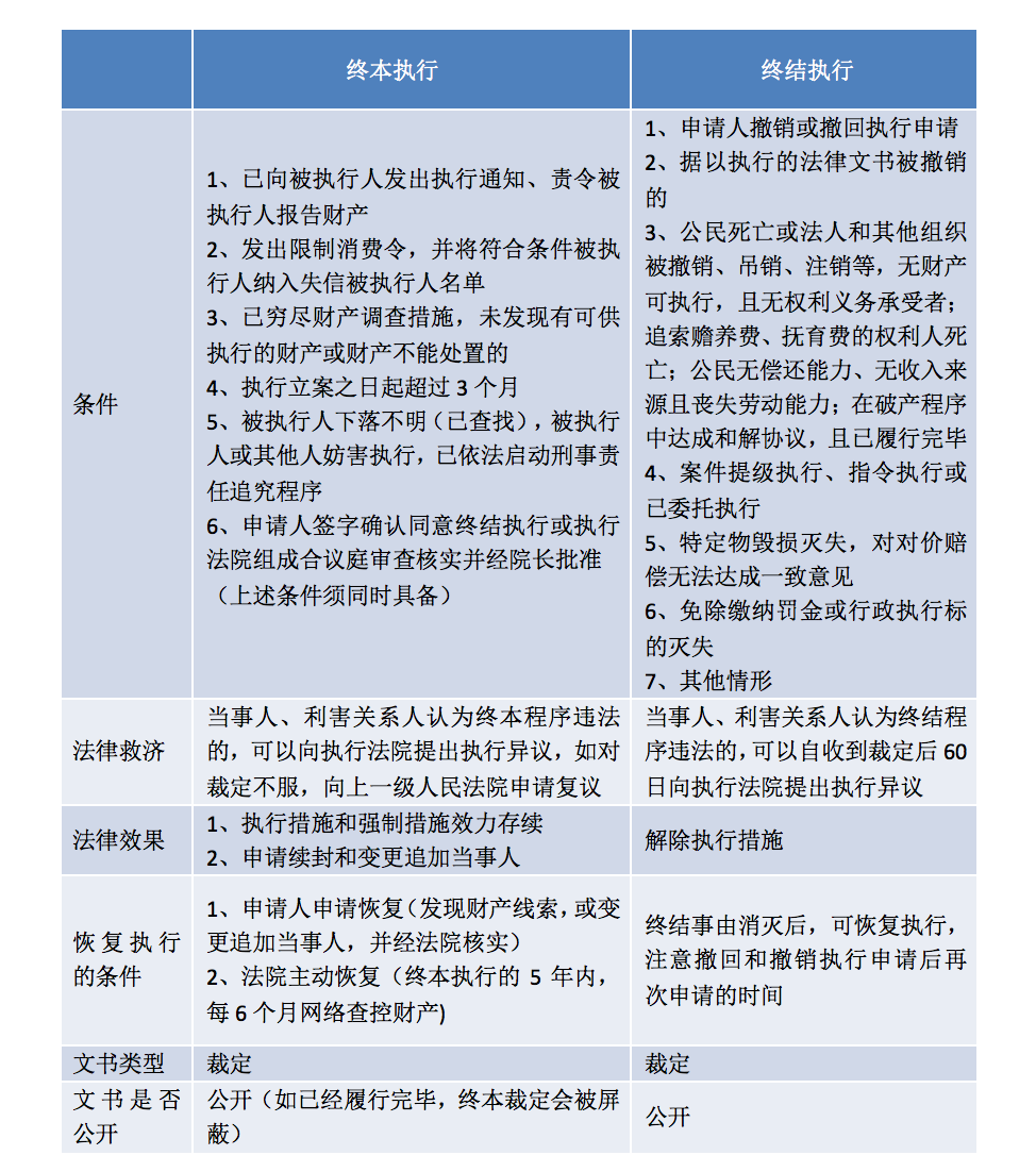 終結執(zhí)行是發(fā)生法律規(guī)定的情形,為解決無法執(zhí)行或無需繼續(xù)執(zhí)行的問題而設立的終結程序。終本執(zhí)行是新的執(zhí)行結案方式,其實質是在窮盡所有財產調查措施后暫時終結了本次執(zhí)行程序。