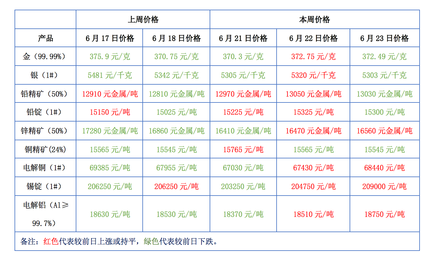 下表為本周金、銀、鉛、鋅、銅、鋁等主要有色金屬礦產(chǎn)品價(jià)格變動(dòng)情況: