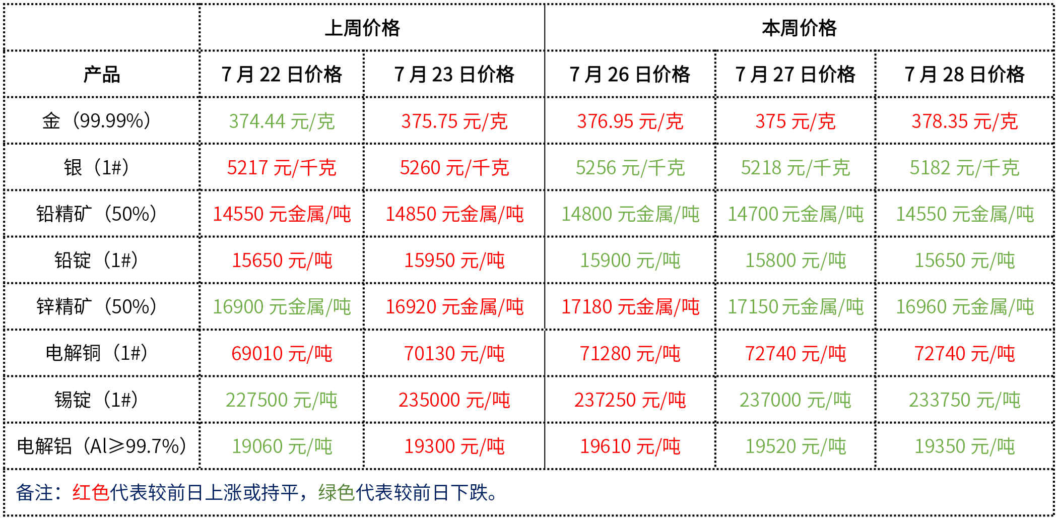 金、銀、鉛、鋅、銅、鋁等主要金屬本周報(bào)價(jià)。