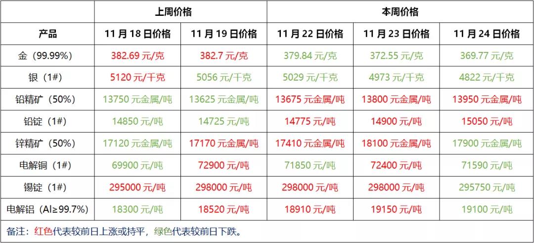金、銀、鉛、鋅、銅、鋁等主要金屬本周報價