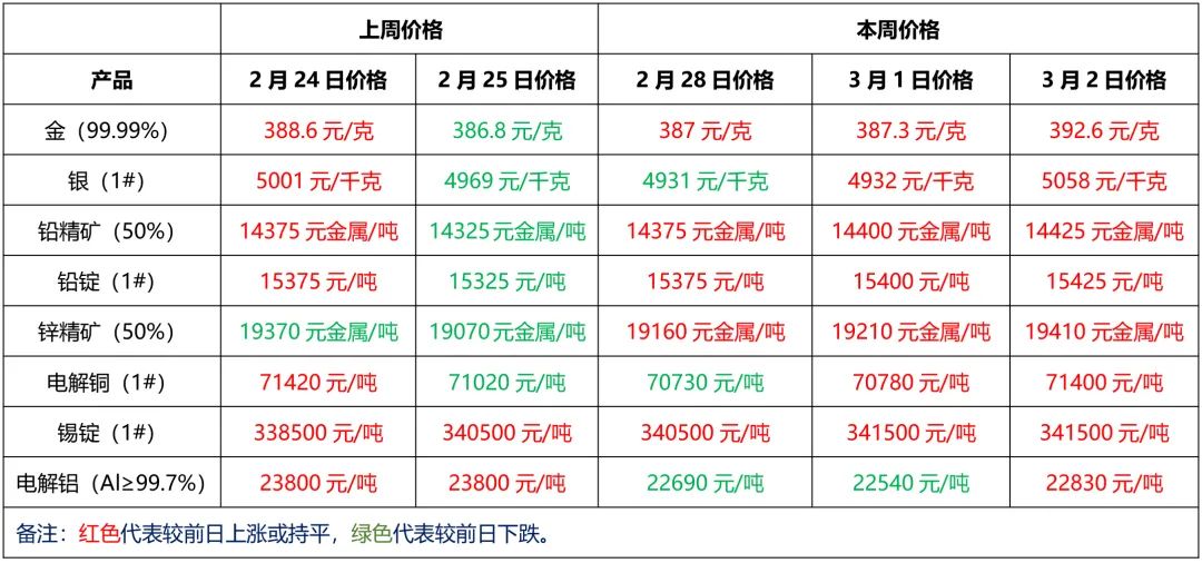 金、銀、鉛、鋅、銅、鋁等主要金屬本周報價