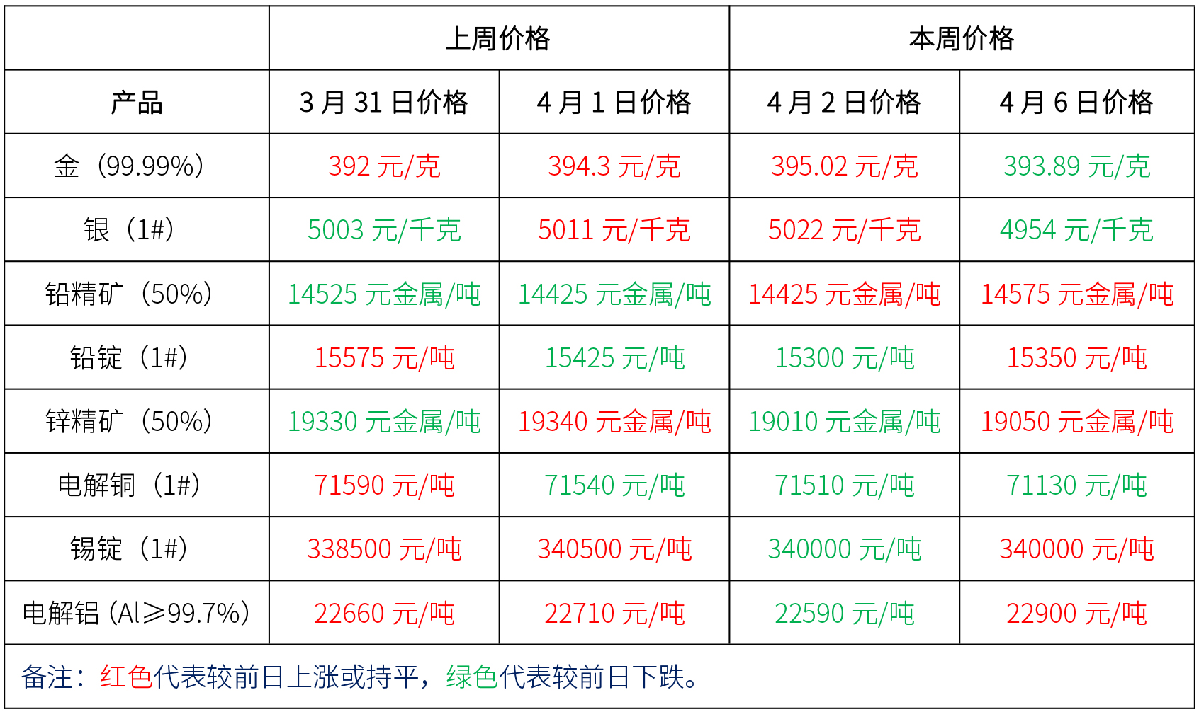 金、銀、鉛、鋅、銅、鋁等主要金屬本周報價