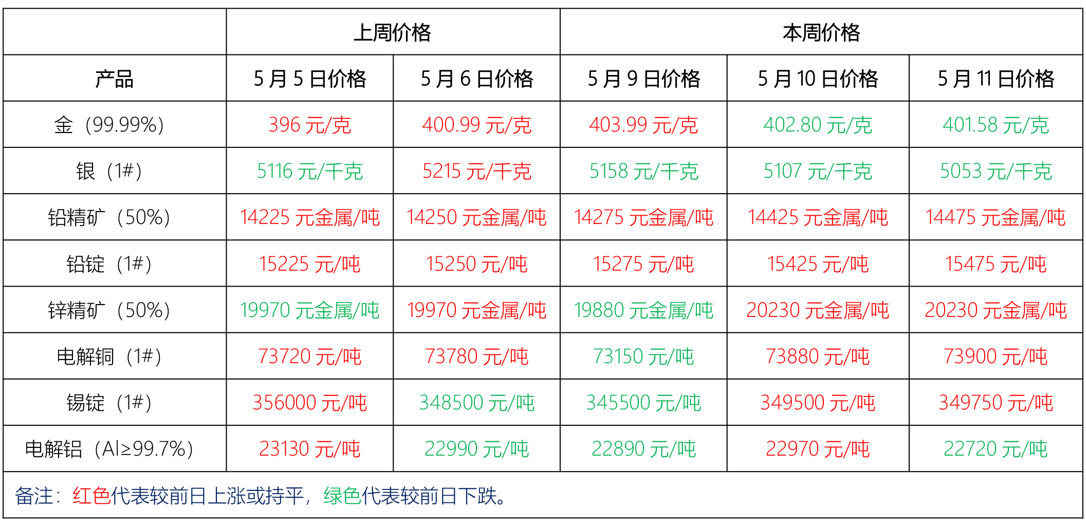 金、銀、鉛、鋅、銅、鋁等主要金屬本周報價