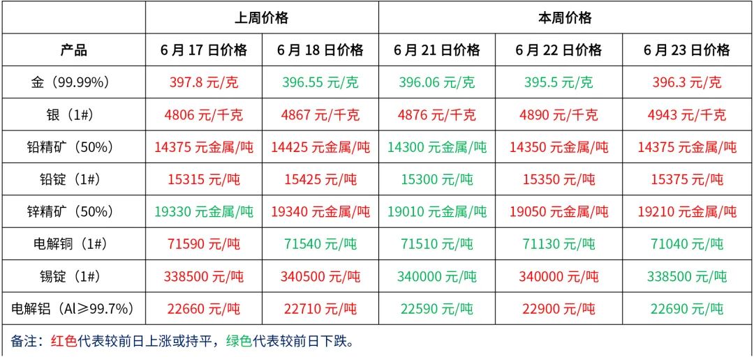 金、銀、鉛、鋅、銅、鋁等主要金屬本周報價