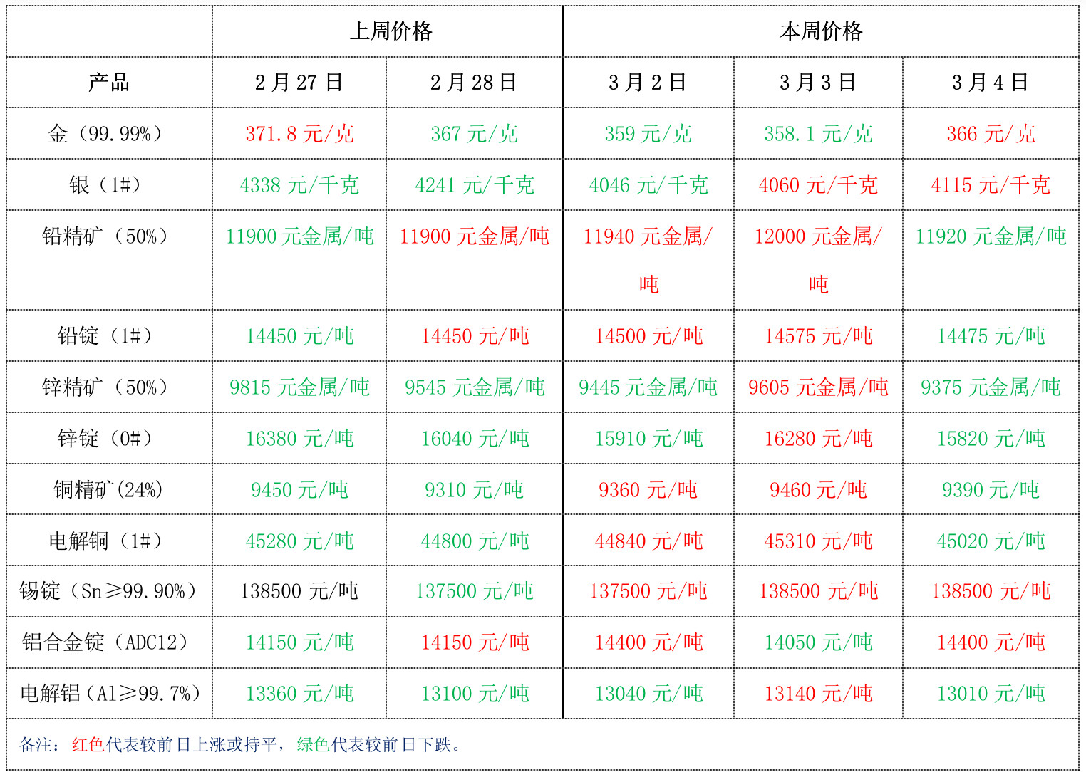 下表為本周金、銀、鉛、鋅、銅、鋁等主要有色金屬礦產(chǎn)品價(jià)格變動(dòng)情況: