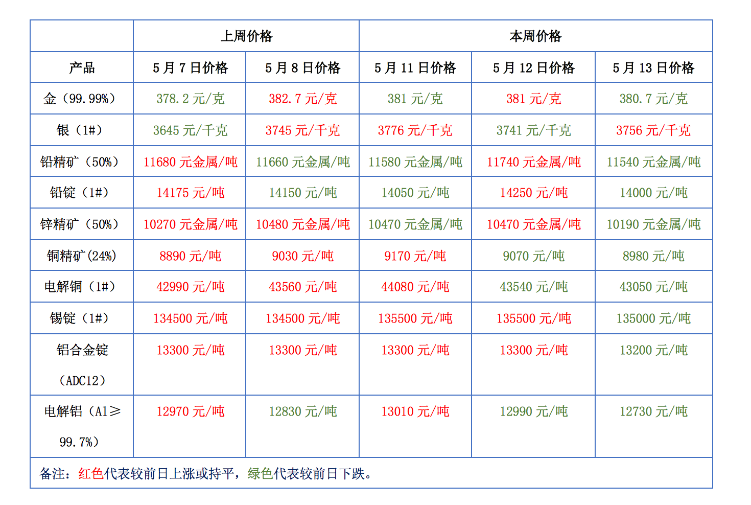 金、銀、鉛、鋅、銅、鋁等主要金屬本周報價