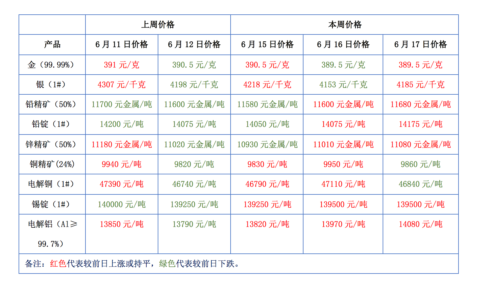 下表為本周金、銀、鉛、鋅、銅、鋁等主要有色金屬礦產(chǎn)品價格變動情況: