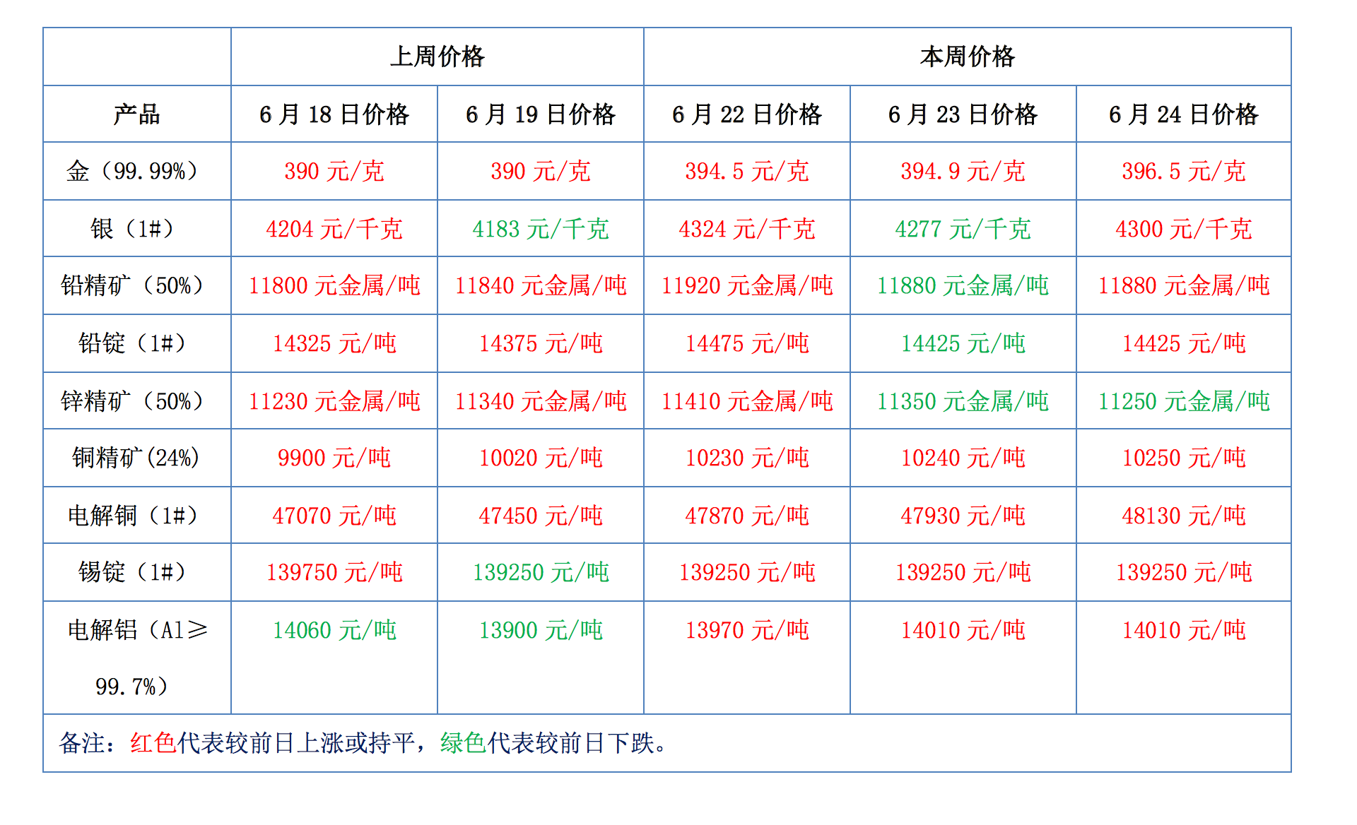 下表為本周金、銀、鉛、鋅、銅、鋁等主要有色金屬礦產(chǎn)品價(jià)格變動(dòng)情況: