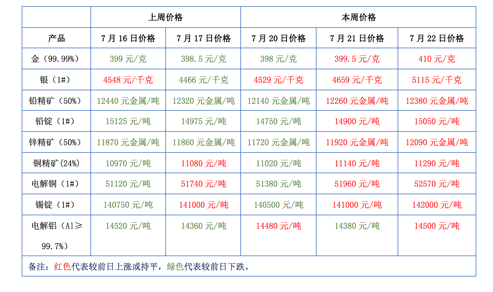下表為本周金、銀、鉛、鋅、銅、鋁等主要有色金屬礦產(chǎn)品價格變動情況: