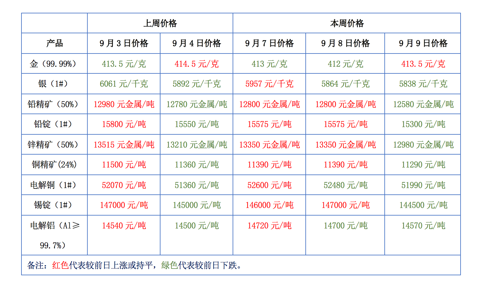 下表為本周金、銀、鉛、鋅、銅、鋁等主要有色金屬礦產(chǎn)品價(jià)格變動情況: