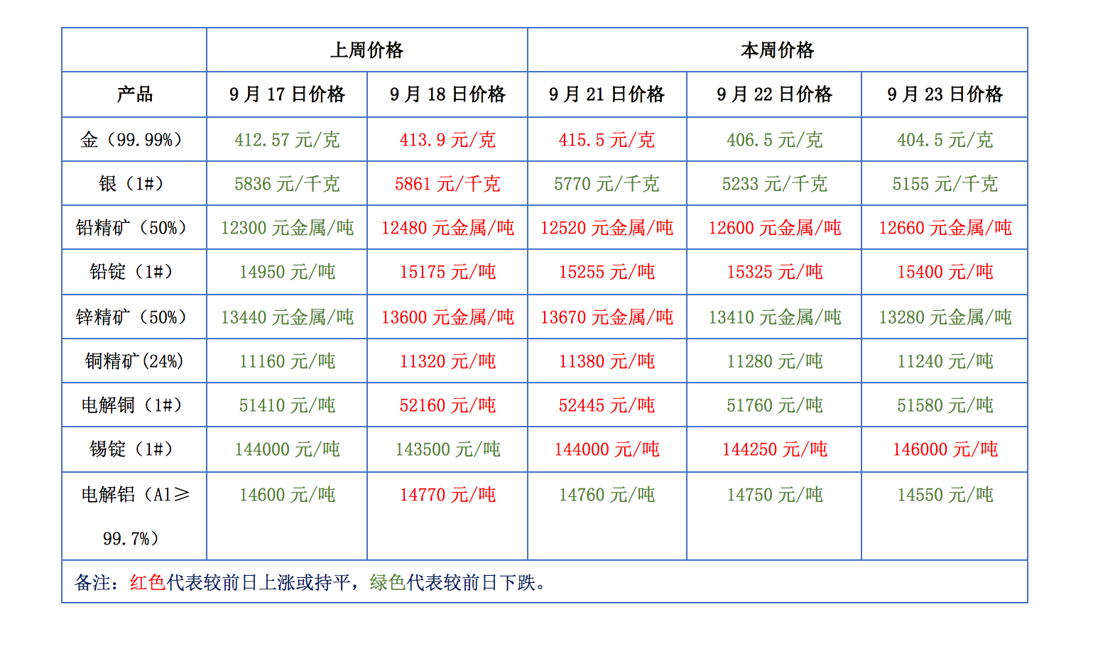 下表為本周金、銀、鉛、鋅、銅、鋁等主要有色金屬礦產品價格變動情況: